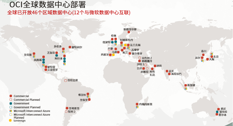 到目前为止, Oracle Cloud Infrastructure(简称:OCI)在全球有46个Region,在公有云厂商中排名第二。为出海企业在全球开展业务提供广泛的应用部署选择并满足合规方面的要求。在中东等地区,OCI有明显的数据中心优势。