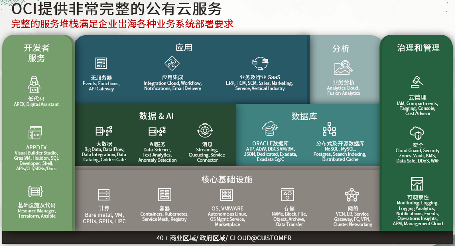 同时,OCI提供非常完整的公有云服务,包括IaaS, PaaS, SaaS服务。可以满足不同类型和规模的企业在不同的发展阶段的业务需求。