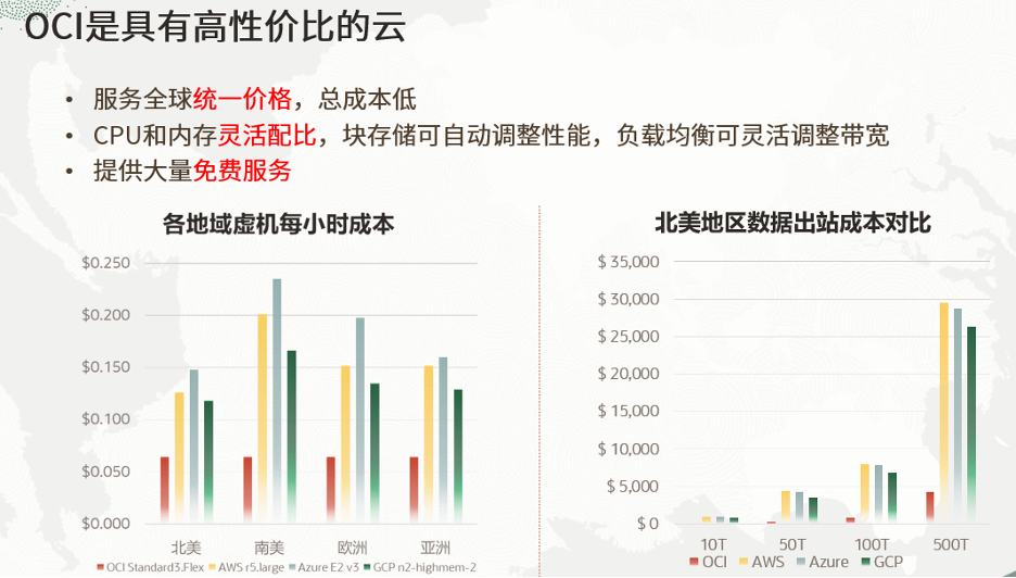 OCI为出海企业提供具有高性价比的云服务。OCI上的服务除了网络出站流量外都是全球统一价格。同时资源是可以灵活配置的,做到真正弹性。同时OCI上还提供了许多免费的服务。从其他云迁移到OCI上,基本都可以节省30%以上的成本。