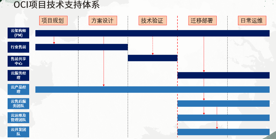 OCI提供免费的端到端的专业技术支持,如下图。云架构师和云产品经理会全程参与项目。其他专业团队会在不同的阶段参与支持项目。快速响应客户遇到的问题,给客户一个良好的使用体验。