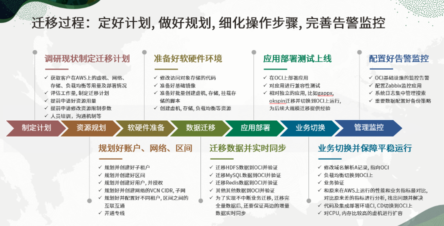 3.更好的技术支持,在整个迁移过程中,Oracle的技术团队和客户的项目成员一起,制定迁移计划,规划好各种资源, 做好各种技术验证,细化迁移的操作步骤, 完善系统的告警监控。实现不影响业务的动态迁移,整个过程如下图。