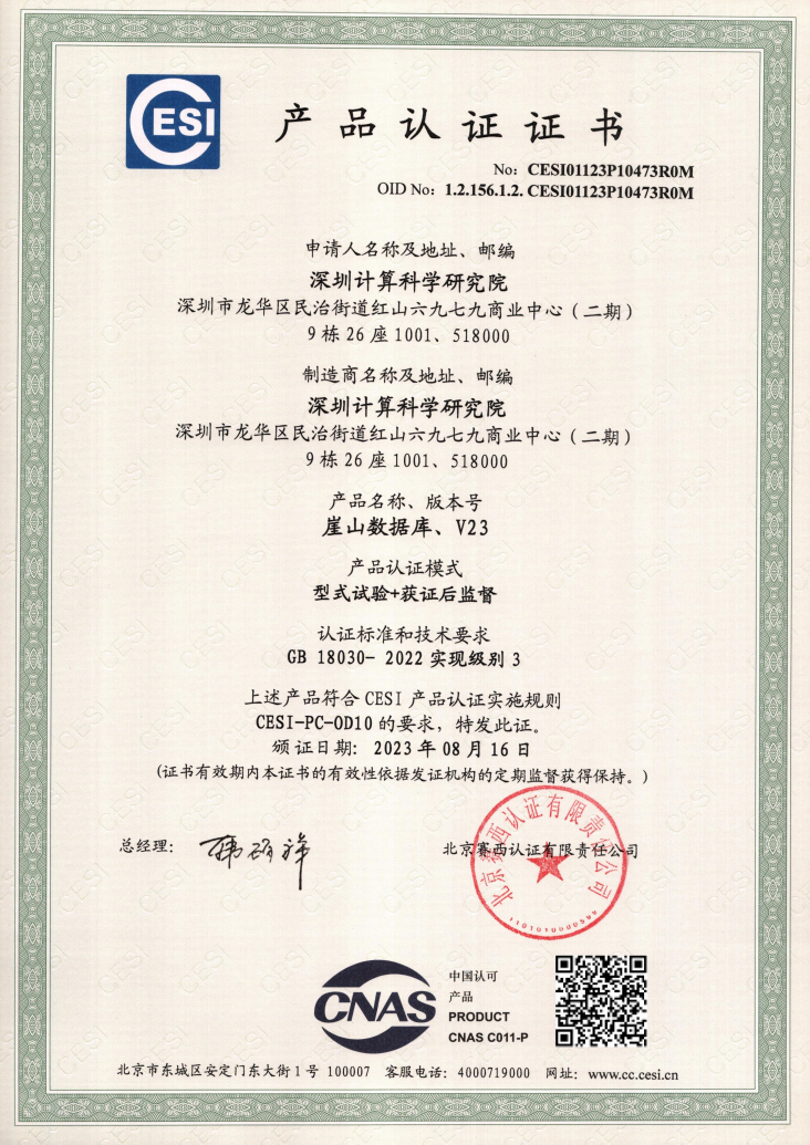 近日,深圳计算科学研究院崖山数据库系统YashanDB V23正式完成了强制性国家标准GB 18030-2022《信息技术 中文编码字符集》适配检测,通过该标准的最高实现级别(级别3)认证,成为数据库领域首批获得该证书的产品,将助力国家语言文字信息化建设工作。
