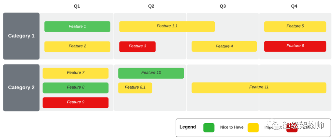上面的图 1 提供了使用 LucidChart 开发和修改的产品路线图的表示。Lucid 的模板有颜色代码作为开发的进展情况(完成、等待、迟到)。我发现这在敏捷世界中相当无用,在这个世界中,迟到并不是什么大事,除了在 sprint 方面——它对于看板来说更不重要。另外,为什么要更新图表以表明它已经晚了,而新的修订版本更好地代表了调整后的计划?我更喜欢用它来定义重要性,因为这为开发团队提供了更大的沟通价值。颜色编码还可用于指示其他关键要素,例如成本、产品领域、领域或团队。