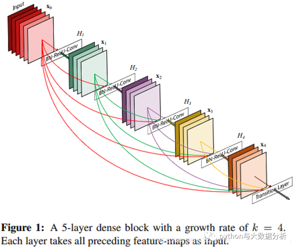 Dense Block:像GoogLeNet网络由Inception模块组成、ResNet网络由残差块(Residual Building Block)组成一样,DenseNet网络由Dense Block组成,论文截图如下所示:每个层从前面的所有层获得额外的输入,并将自己的特征映射传递到后续的所有层,使用级联(Concatenation)方式,每一层都在接受来自前几层的”集体知识(collective knowledge)”。增长率(growth rate)k是每个层的额外通道数。