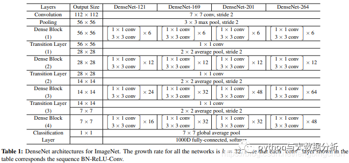 DenseNet也是一个系列,包括DenseNet-121、DenseNet-169等等,论文中给出了4种层数的DenseNet,论文截图如下所示:所有网络的增长率k是32,表示每个Dense Block中每层输出的feature map个数。