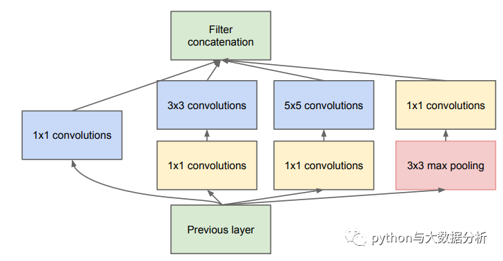 inception模块的基本机构如图所示,整个inception结构就是由多个这样的inception模块串联起来的。inception结构的主要贡献有两个:一是使用1x1的卷积来进行升降维;二是在多个尺寸上同时进行卷积再聚合。