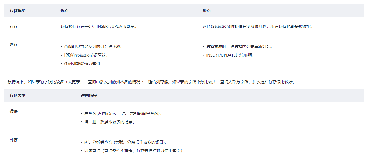 行存储是指将表按行存储到硬盘分区上,列存储是指将表按列存储到硬盘分区上。默认情况下,创建的表为行存储。行存储和列存储的差异请参见图1。