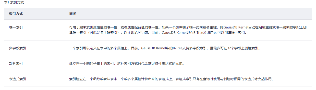 GaussDB Kernel支持4种创建索引的方式请参见表1。