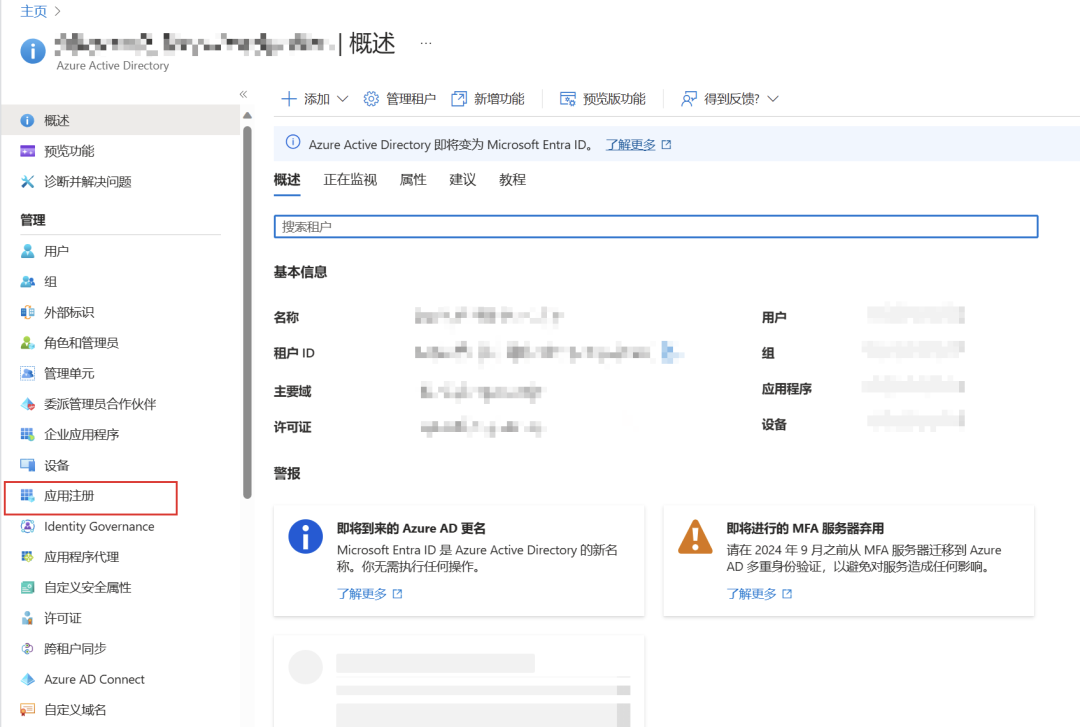 点击左侧的“应用注册”菜单。