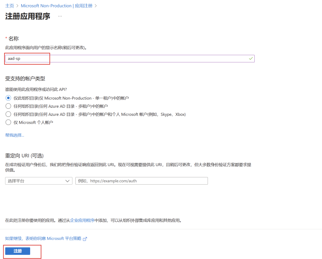 点击注册按钮,并填写基本信息以添加 AAD 应用,即服务主体。