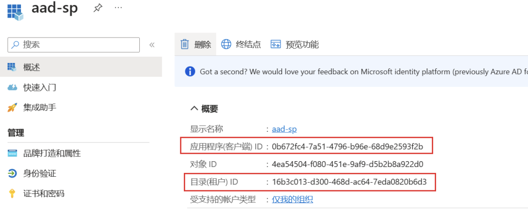 记录并保存该应用的应用程序(客户端)ID 和租户(目录)ID 信息。