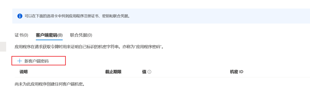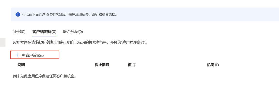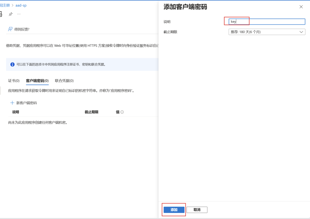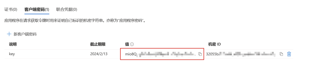 点击“证书和密码”菜单,添加密钥,有效期最长可以是 2 年,并记录密钥值。这三个信息将会用于获取 Azure AD 的令牌以访问 OpenAI 服务。