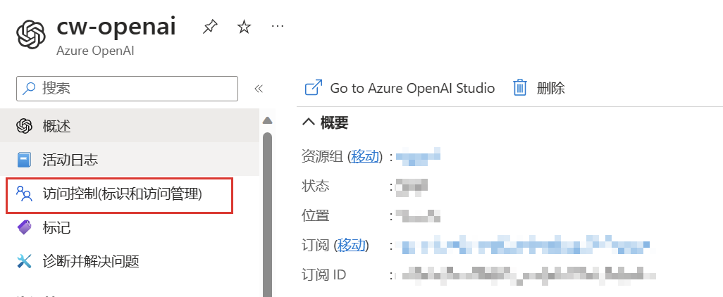 打开您的 OpenAI 服务实例,点击左侧菜单中的访问。