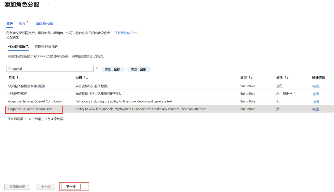 在角色列表中查找“OpenAI User”角色,选中后点击“下一步”。