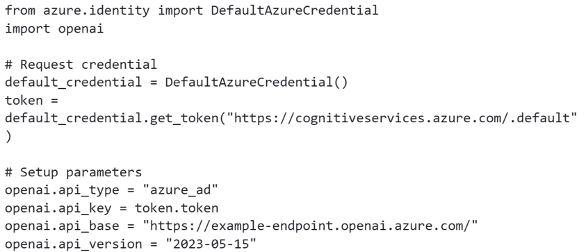 OpenAI 官方 SDK 支持 AAD 访问,因此我们只需要将 openai.api_key 设置为 AAD 应用获取的令牌即可。示例代码如下: