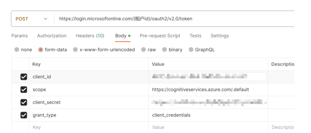其中 AAD 令牌的获取需要使用 azure.identity 库,可以通过应用密钥或证书从 AAD 颁发令牌。如果您更倾向于通过 Rest API 调用,那么获取令牌的方式如下:Host: https://login.microsoftonline.com/{tenant id}/oauth2/v2.0/token