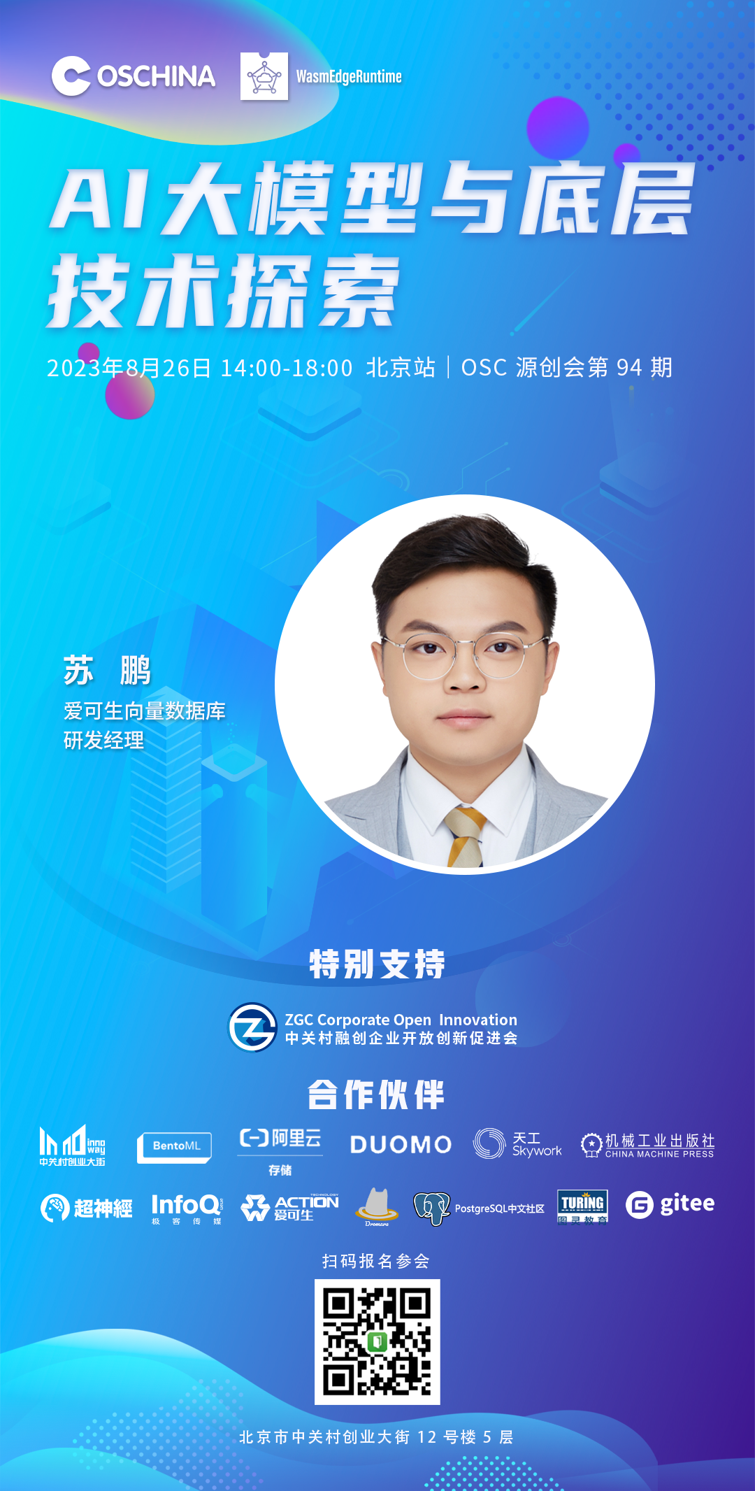 未来,大模型技术研究将会向哪个方向发展,又将如何赋能千行百业?身处其中的我们该如何拥抱新变化?为了找寻答案,开源中国联合 WasmEdgeRuntime 共同举办以 “AI 大模型与底层技术探索” 为主题的【源创会】线下技术沙龙,邀请来自业界和学界的专家分享他们在 AI 大模型与底层技术方面的研究成果和实践经验。来自爱可生的向量数据库研发经理 - 苏鹏,将在现场带来《智能运维交互的创新实践》主题演讲,敬请期待。