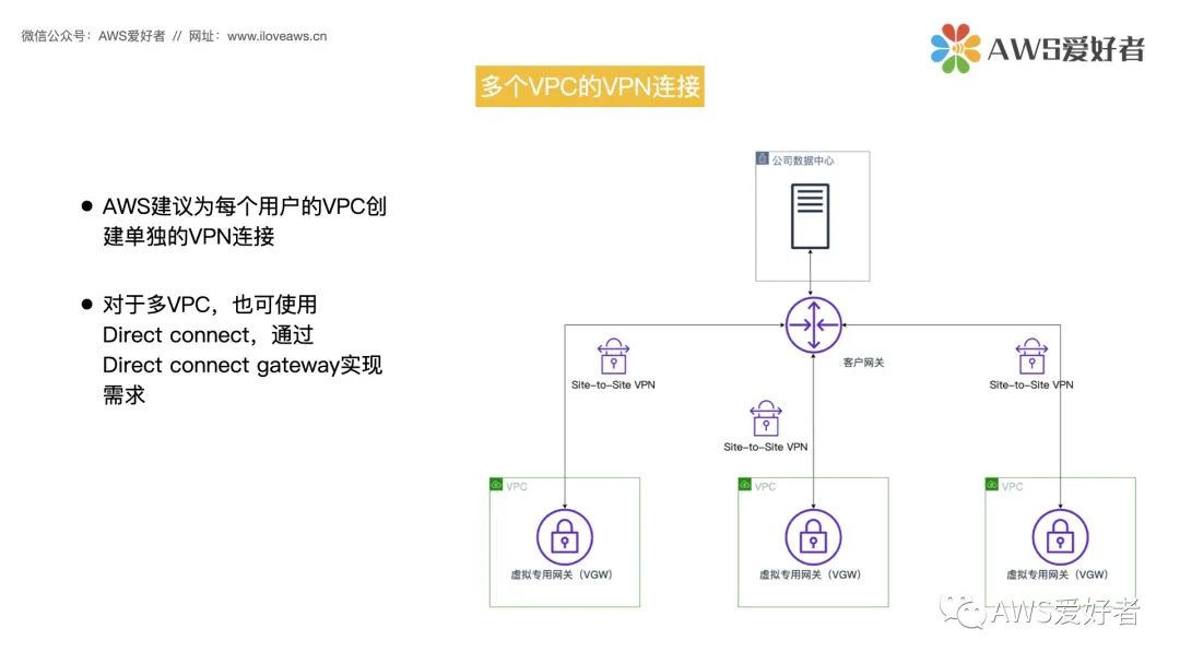 如果您有很多个VPC,AWS建议使用Direct connect,然后使用Direct connect gateway来实现上述的需求。Direct connect的内容我们后面的课时会讨论。