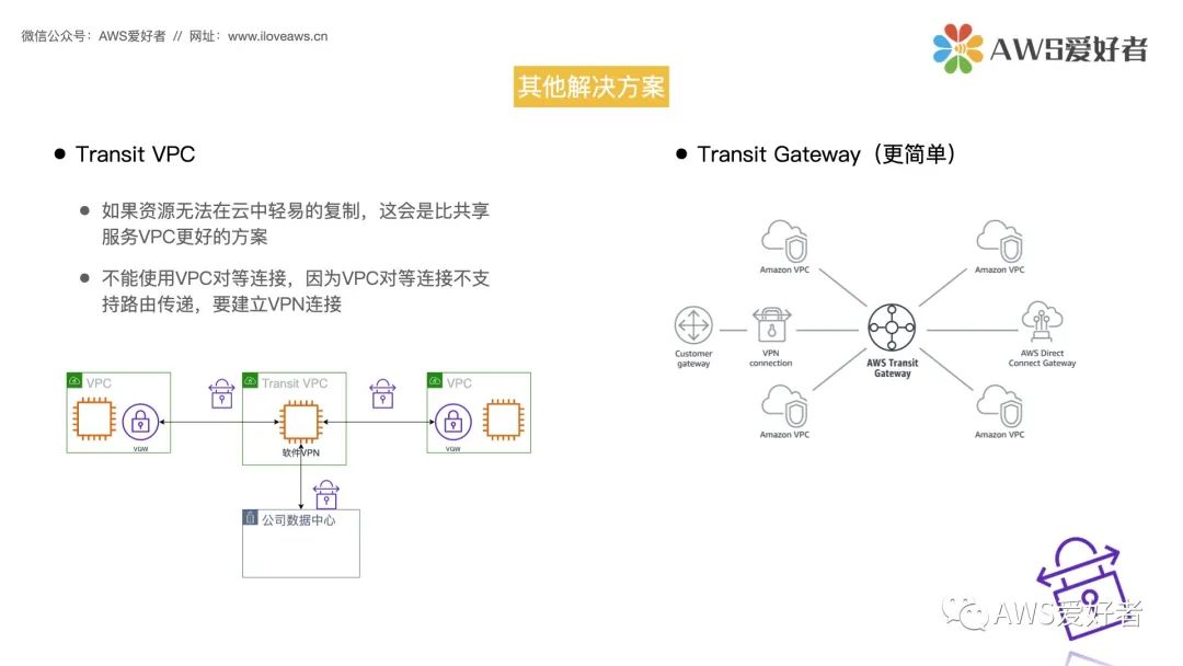Transit VPC 的这种方式相比前面讲的共享服务VPC的优点在于,如果使用共享服务VPC的方式,如果有一些本地的服务或者程序不是非常容易配置复制,那就没有办法在共享服务VPC中提供给其他VPC进行访问,而在这种情况下使用Transit VPC就会非常的容易和方便。