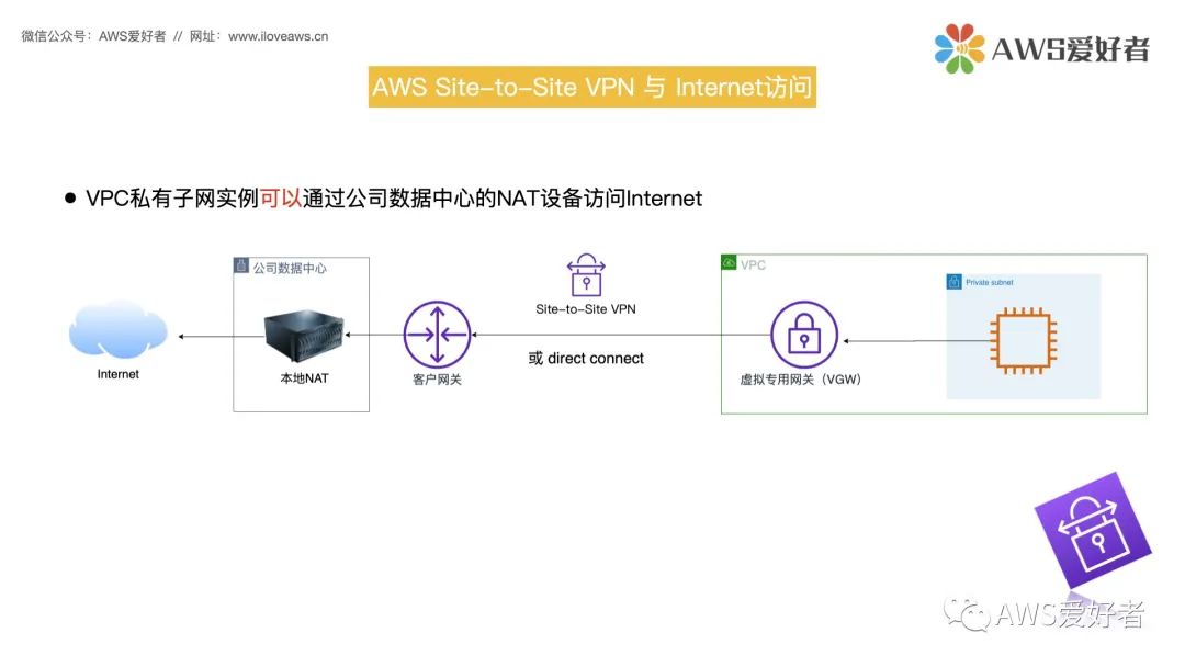 这种方式是可行的。在这种架构下,在AWS是不需要配置NAT网关或者NAT实例的,只需要按照实际情况配置好本地NAT路由表等配置,就可以实现在私有子网的实例通过AWS Site-to-Site VPN 。通过本地数据中心访问Internet。