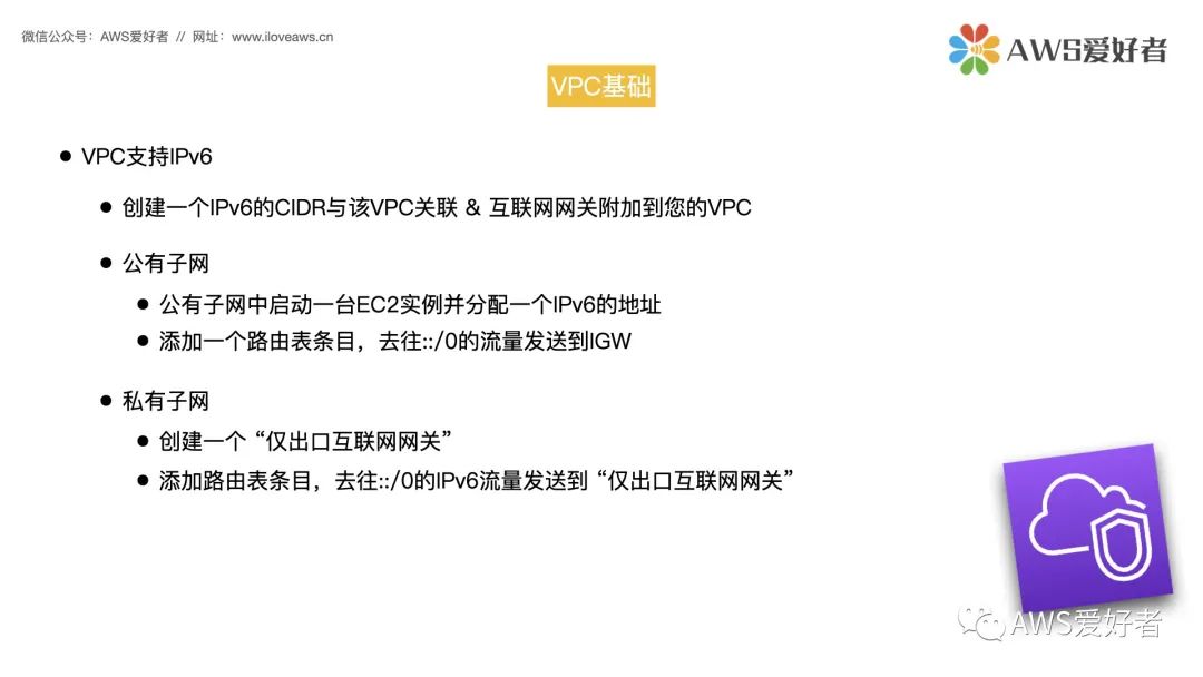 首先在创建VPC的时候,创建一个IPv6的CIDR块与该VPC关联,然后将互联网网关附加到您的VPC,互联网网关是支持IPv6的。