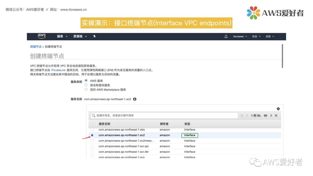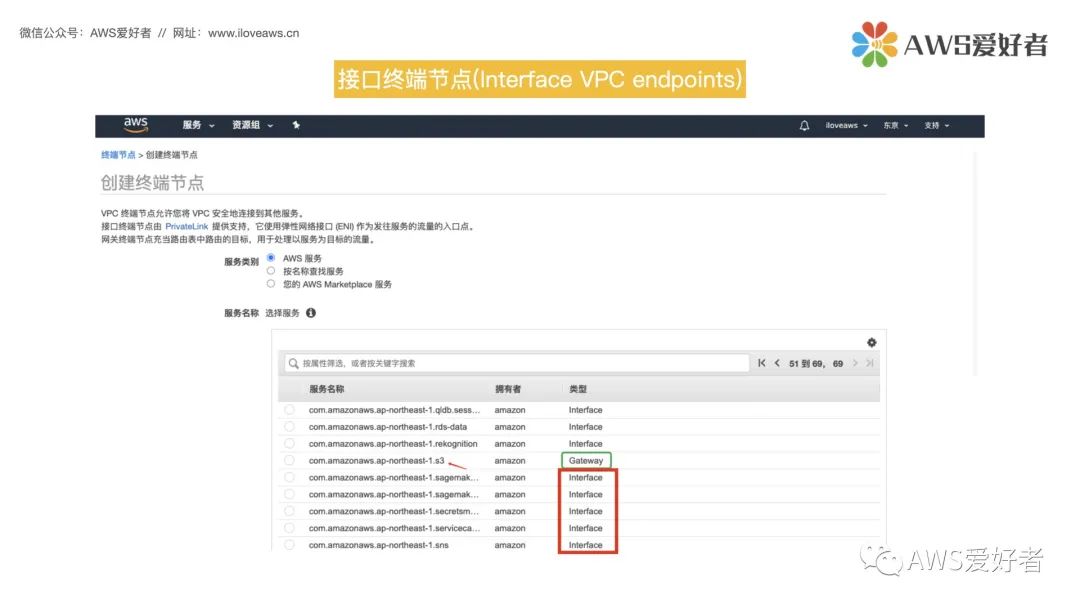 在上节课后面的内容我们实操演示创建了一个用来访问S3服务的网关终端节点,在创建终端节点时可以看到,VPC终端节点的另一种类型—接口终端节点,接口终端节点支持更多的AWS服务。