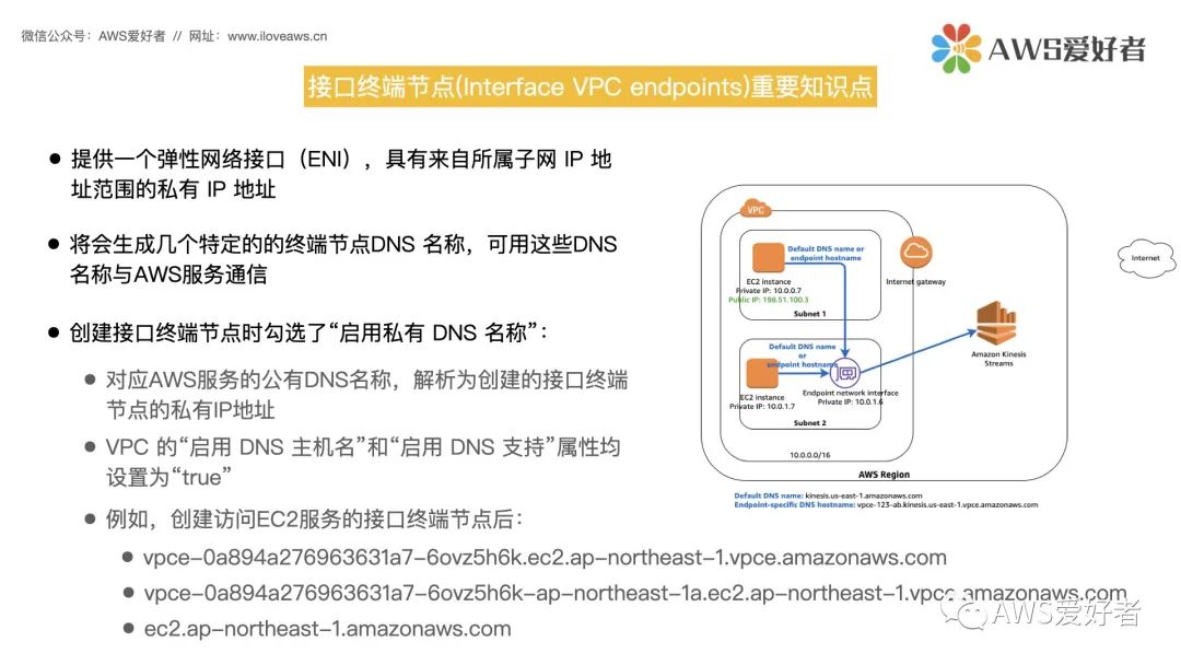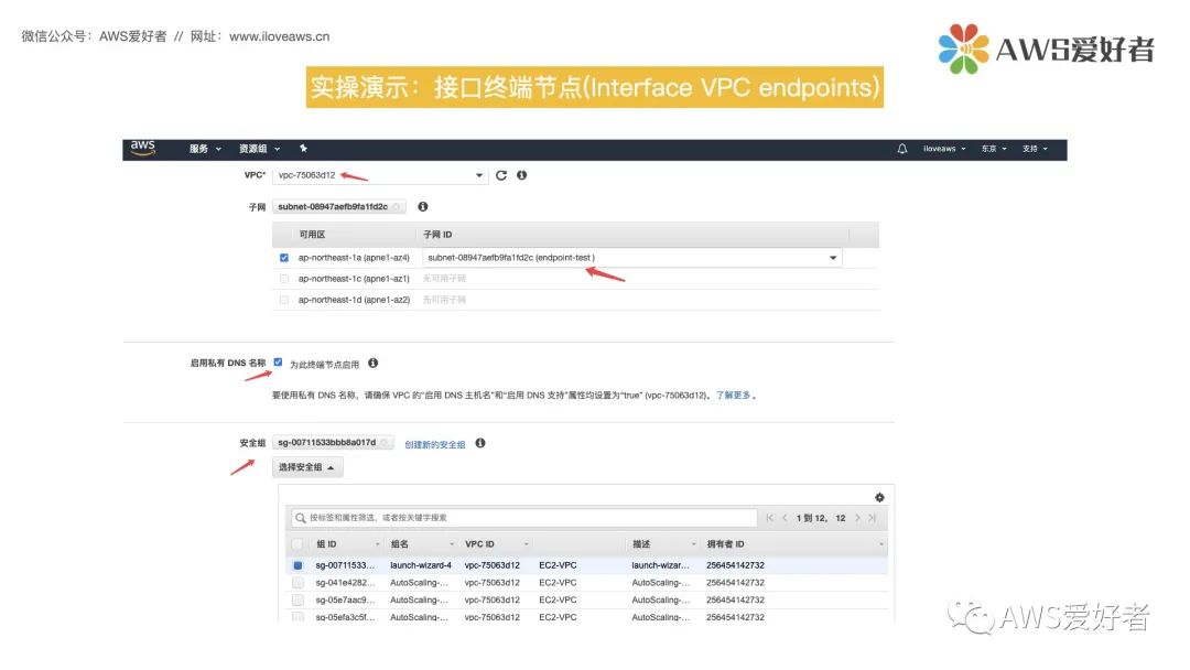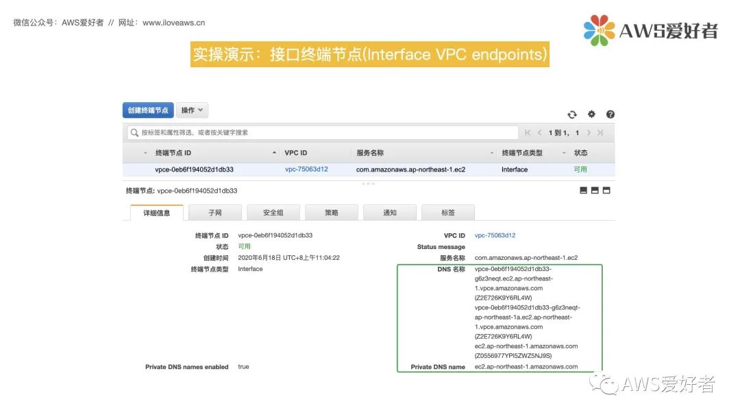 创建接口终端节点后,将会生成几个特定的的终端节点DNS 名称,可用这些DNS名称与AWS服务通信。