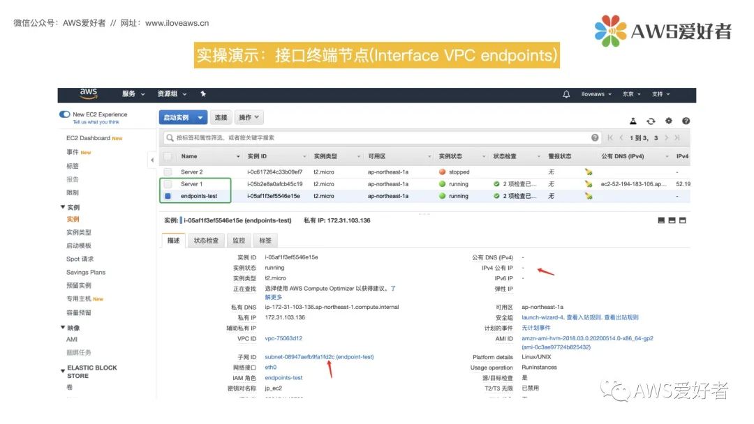 目前有两台已启动的EC2实例,名为server1和endpoints-test。