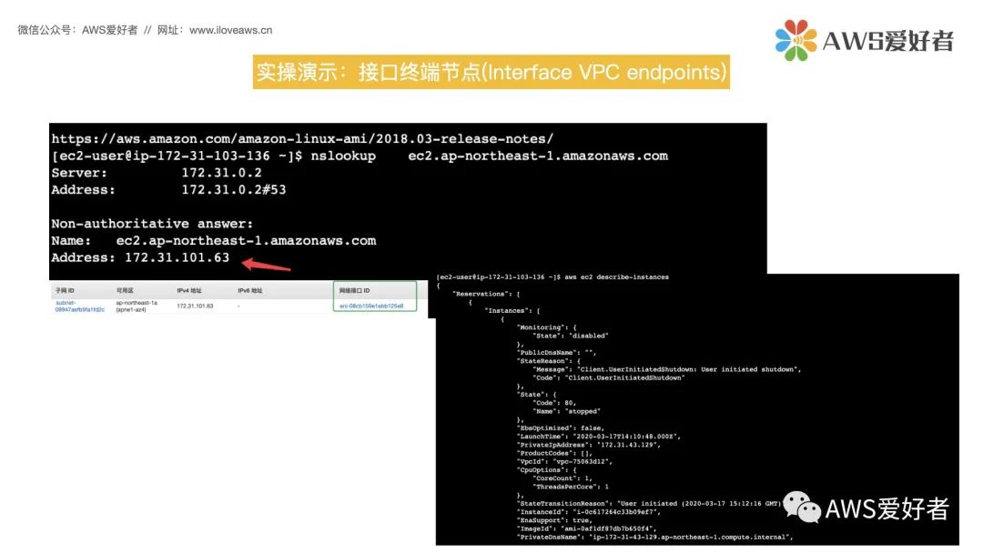 如果在前面勾选了“启用私有DNS名称”,那么这个DNS地址就会重新解析为这个接口终端节点的私有IP地址。这样在调用EC2 API时,就会通过终端节点的私有IP地址。即使我们演示的EC2无法访问internet,同样可以通过终端节点访问EC2服务。