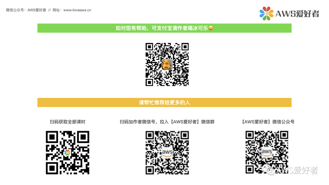 如果您想加入「AWS爱好者」微信群和其他同学交流,请:chenmoemo,后拉入「AWS爱好者」微信群。