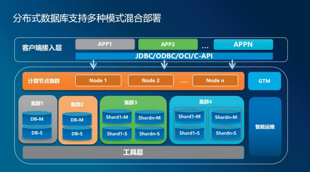 如图所示,分布式数据库采用无共享的分布式架构设计,由计算节点集群、存储节点集群、管理节点和全局事务管理器四个部分组成。