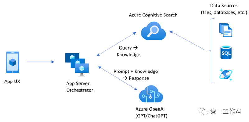 如上图,企业可以将数据,例如 SQL 数据库、Cosmo 数据库或文档作为数据源,使用搜索引擎,例如 Azure 认知搜索,创建索引。当我们使用设备上的 App 去访问服务器上的应用,就可以和 Azure OpenAI 的大模型,例如 GPT 或 ChatGPT 进行对话。