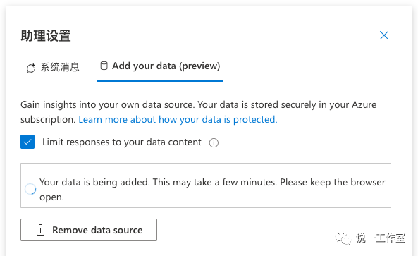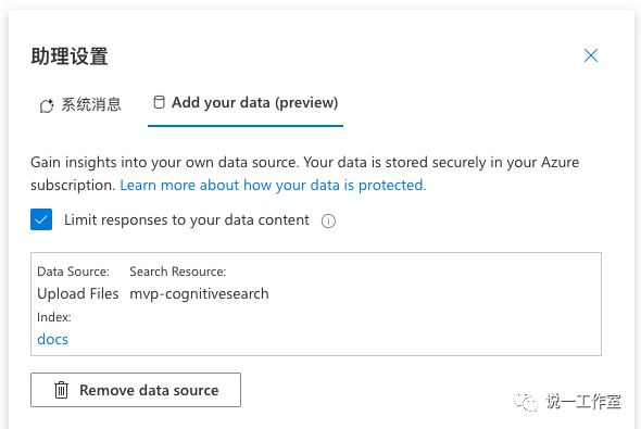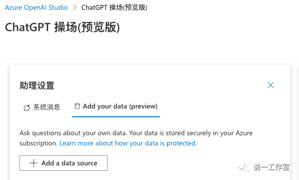 点击打开,就是朴实无华的一个“Add a data source” 按钮。添加的数据将用于帮助 ChatGPT 更靠谱地和人聊天,这些数据将保存在 Azure 订阅的存储服务,为了避免担心数据的泄漏,还提供了有关数据保护的链接参考。