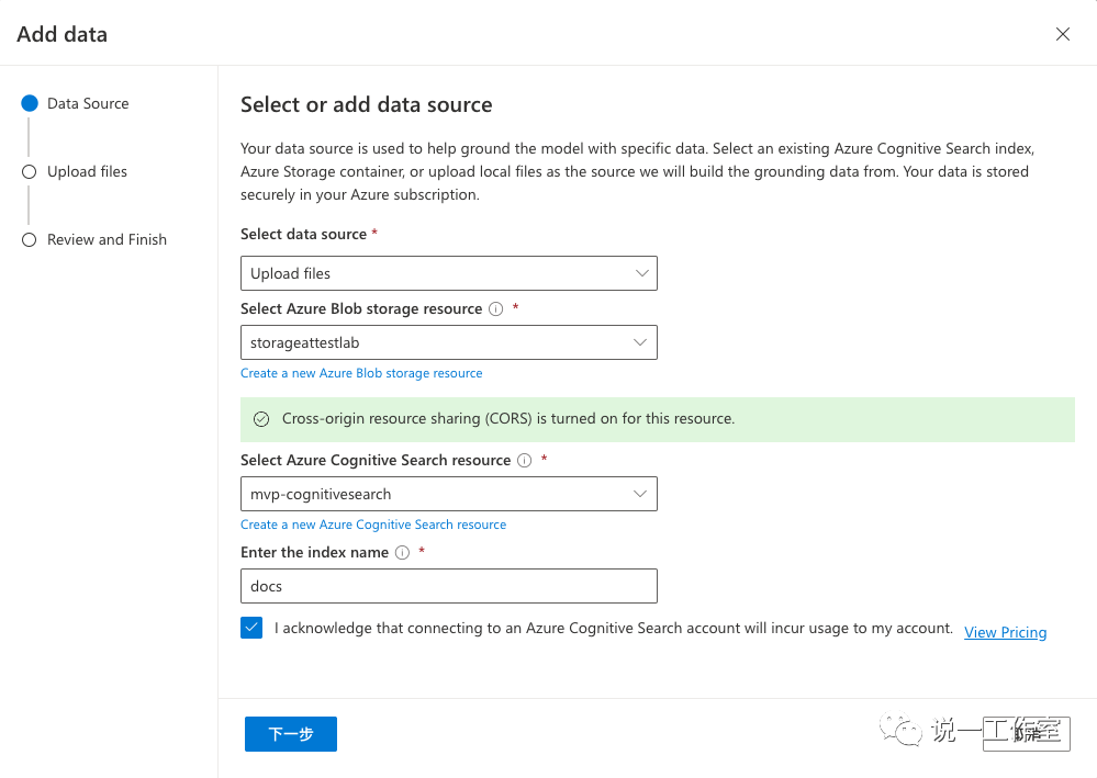 免费定价层的 Azure 认知搜索是不能够用在这个功能里的。所以我们就用 Basic 的定价层创建一个 Azure 认知搜索服务来使用。选择上传文件这个数据源之后,可以看到向导中需要指定 Azure Blob 存储资源。向导会提示启用 CROS 跨源资源共享。向导会在 Azure Blob 存储上自动创建文件容器,以存放上传的文件。然后,选择或者直接创建免费定价层之上的 Azure 认知搜索以提供搜索。使用认知搜索的时候,还需要为创建的索引输入一个索引名称。