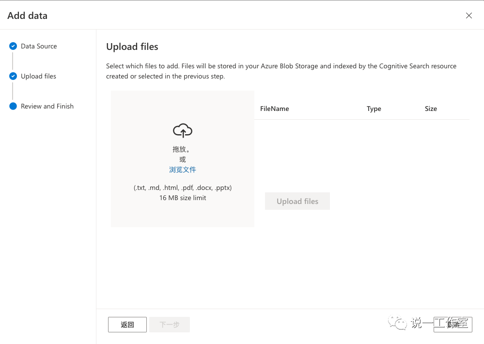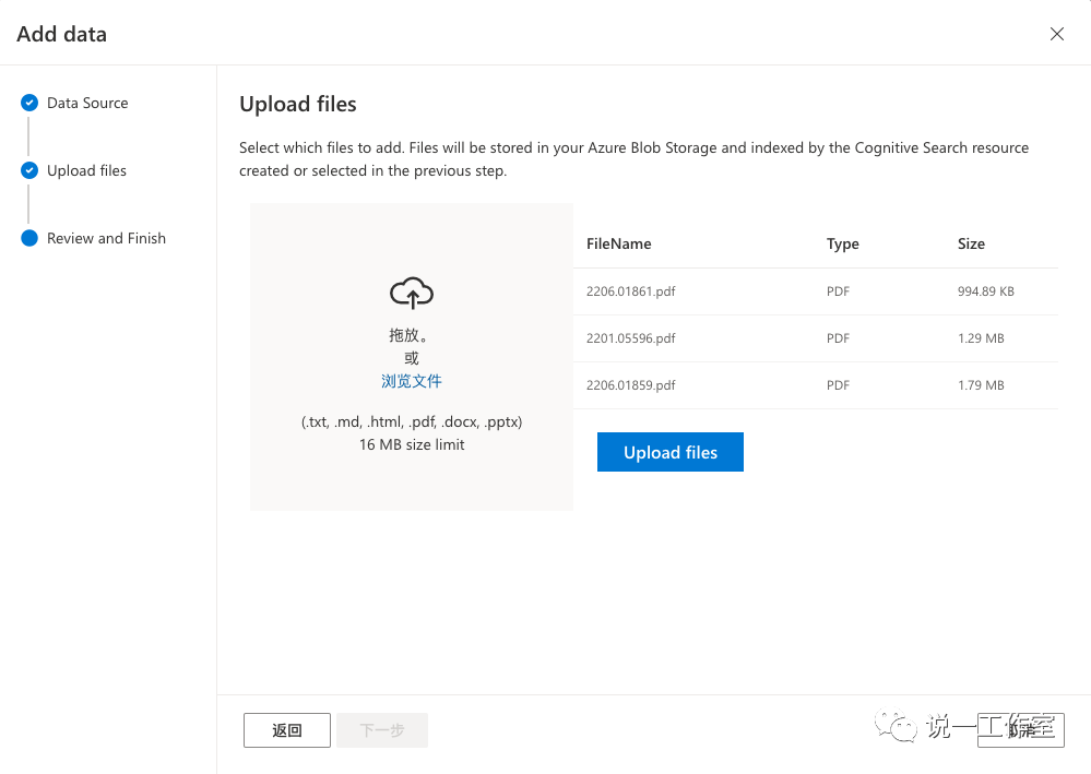 信息都输入完成后,就可以点击“下一步”,继续使用向导。向导会提示上传文件。支持浏览文件和拖放文件到上载区域。文件类型可以是 .txt 文本、.md MarkDown文本、 .html HTML文件、.pdf PDF文件、.docx Word文档和 .pptx Powerpoint 文档。大小不能超过16MB。Azure 认知搜索能够支持上述文件数据,对其进行处理索引,用以支持快速查询。