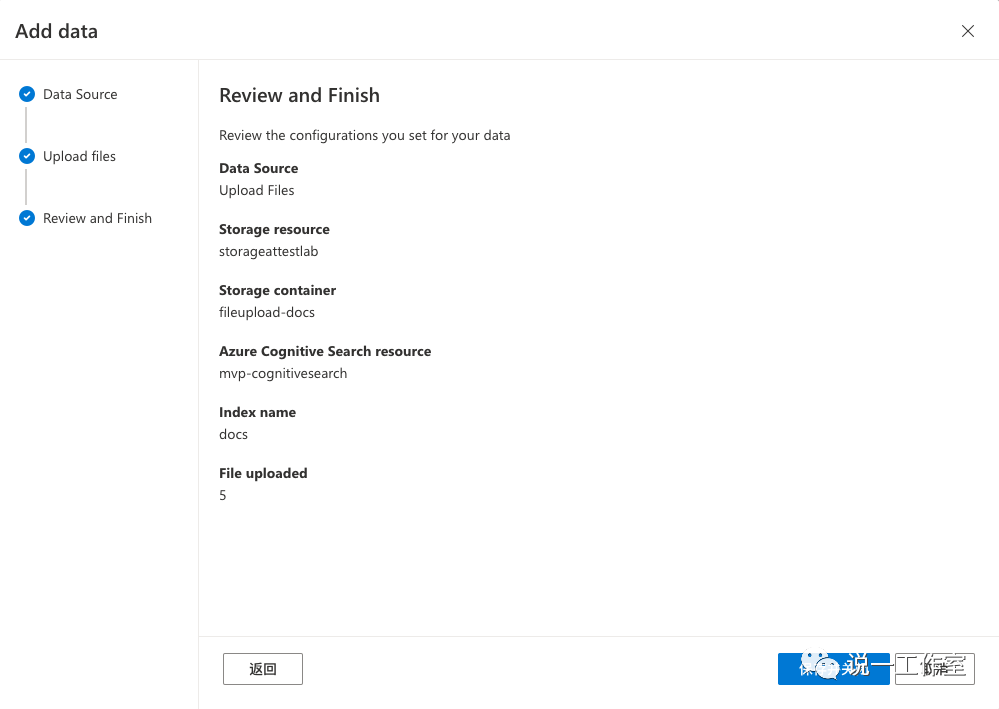 实际我们已经看到有三种添加数据的方式:添加 Azure 认知搜索、添加 Azure Blob 存储和上传文件。其实 … 这三个选项是一样的,只不过一个是已经配置好认知搜索,一个是配置了 Blob 存储及容器然后配置认知搜索,一个是通过向导上传文件同时配置存储和认知搜索。