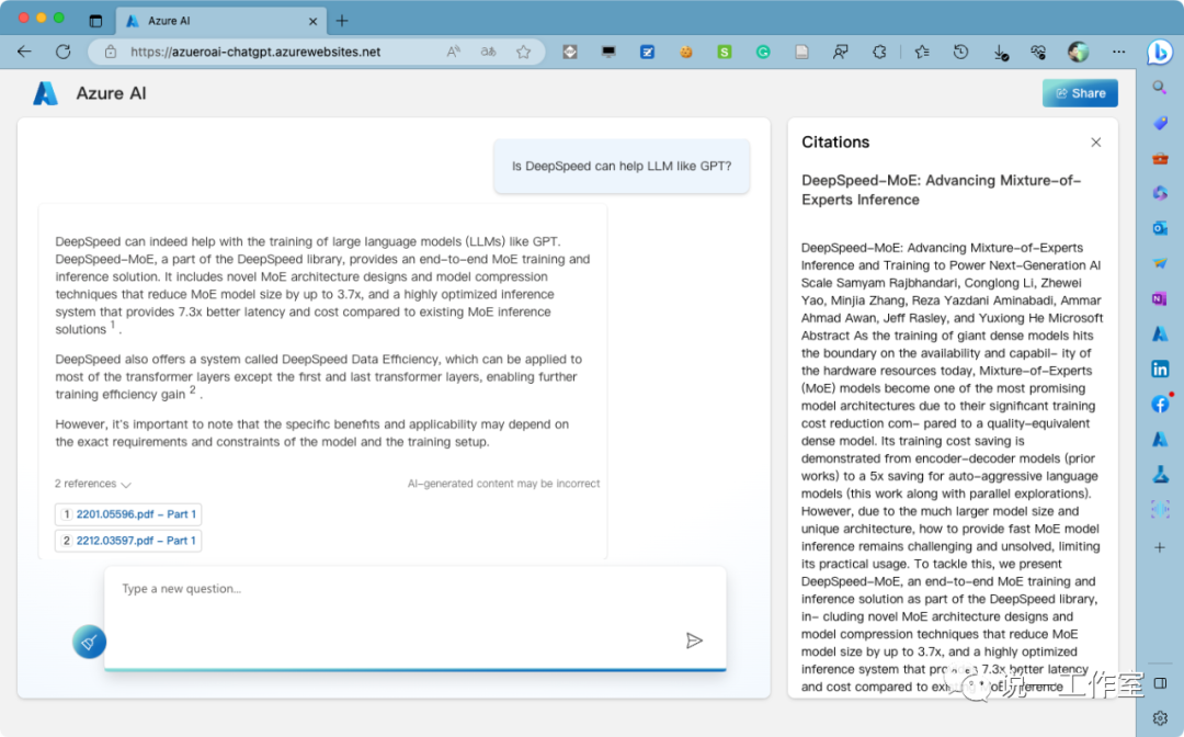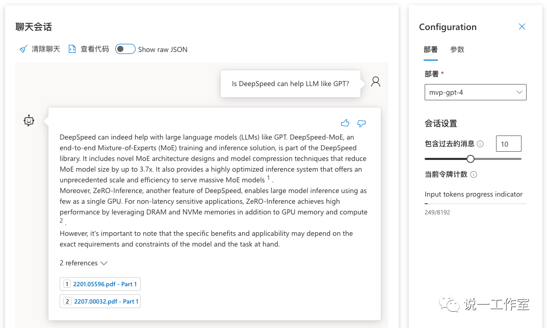 我们马上用 ChatGPT Playground 来测试一下。我上传的其中一个PDF文件是编号 arxiv:2207.00032 的一篇论文,是微软关于 DeepSpeed 加速人工智能的介绍。所以我在聊天窗口提了一个关于 DeepSpeed 的问题。