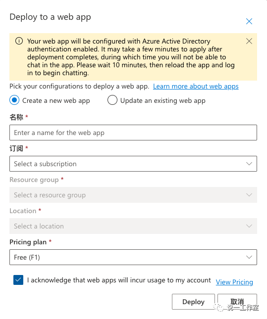 除非你已经有一个现成的、空的 web app,不然还是建议新建一个。因为向导会向这个 web app 部署代码。如果跟现有的 web app 已有环境冲突,部署就会失败。如果只是测试,可以选择免费定价层 F1。