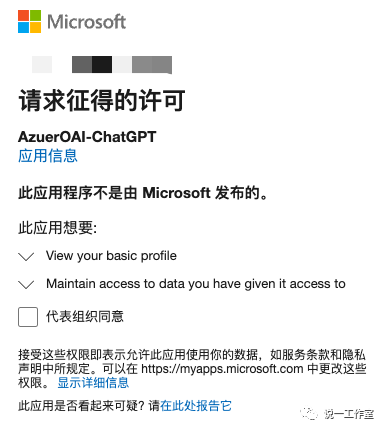 部署会需要一点时间,成功后会出现一个紫色的 “Launch web app” 的按钮。点击即可打开站点。首选会向你请求 Azure AD 的验证许可。同意后就打开了 web app 的页面。