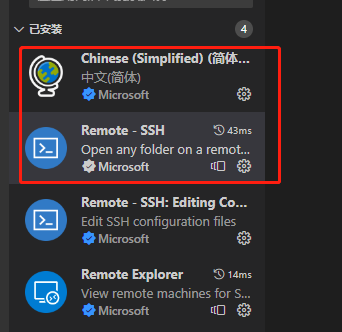在 VSCode 应用商店搜索并安装以下插件:Chinese、Remote(红框所示部分,下面两个是 Remote-SSH 的依赖,自动带出来的)。