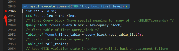 连接 MySQL 成功之后,在 MySQL 源码中打个断点,先打开 sql/sql_parse.cc
