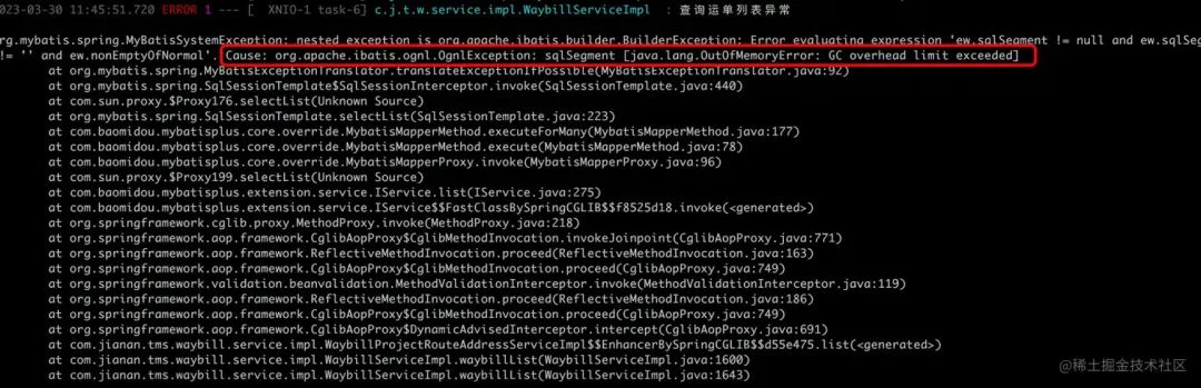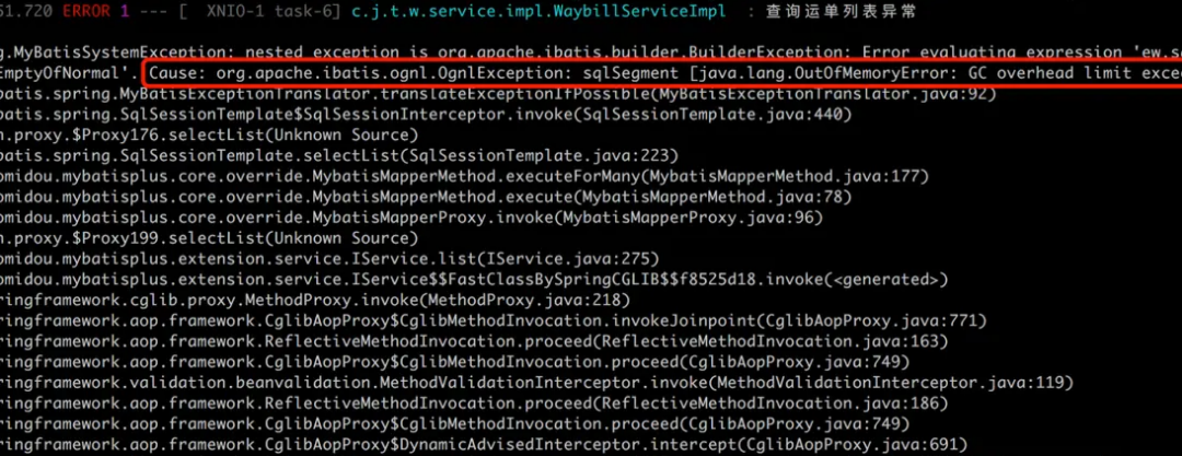 根据生产环境的报错日志来看,这边属于 Mybatis 报出的一个内存溢出情况,通过去看 Mybatis 源码发现,底层也是通过一些集合类来存放拼接的 sql,那么当然也有可能出现堆内存溢出,而且在 sql 体积比较大的情况下,接收 sql 的集合就会变的非常大,如果回收不了那么就会导致内存溢出。