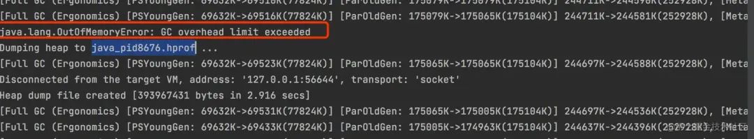 这里看控制台打印的日志,服务在频繁的进行 Full GC,导致 OOM。