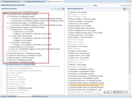 开启自动配置,该注解会使SpringBoot根据项目中依赖的jar包自动配置项目的配置项,如:我们添加了spring-boot-starter-web的依赖,项目中也会引入SpringMVC的依赖, SpringBoot就会自动配置tomcat和SpringMVC。利用依赖的传递性把相关的依赖都引入,我们可通过依赖层次结构查看关系。