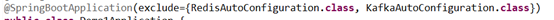 四,通过exclude配置,排除自动配置。如图排除redis,kafka的自动配置。
