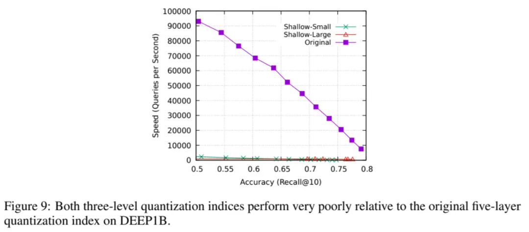 如下图,文中给出了一个多层量化索引的例子,在billion-scale的数据集上比较了层数更多更复杂的索引结构(Original)与其两个简化版本(Shallow-Small、Shallow-Large)的检索效果。可以明显看出,结构更复杂的索引在召回率和吞吐量两个角度都表现出了明显的优势。