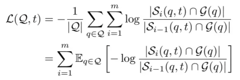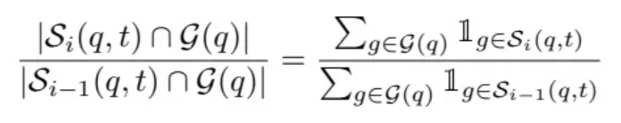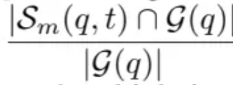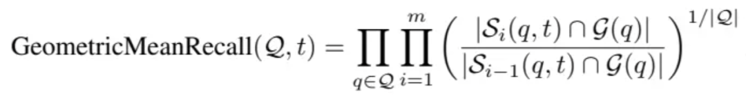 下式给出了多层量化索引的召回率计算方法,即,给定参数配置 t 构建的 m 层量化索引的查询结果 Sm(q,t) 和真实解 G(q) 的交集大小比上真实解数量。