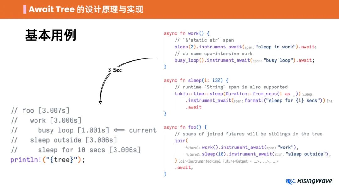 基于上述思想,我们推出了 Await-Tree 这一 Async Rust 的调试工具。顾名思义,Await-Tree 能够在运行时追踪关键 Future (即 await