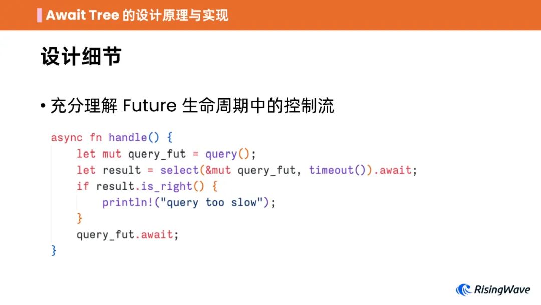 函数的控制流而维护的,为了让 Await-Tree 能够正确地反映一个 Async Task 的执行状态,其中最关键的便是需要充分理解 Future 整个生命周期中可能存在的控制流。