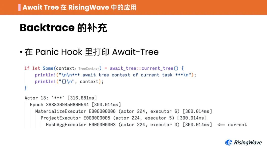 Await-Tree 原生面向 Async Rust 中的 Task 设计,可以提供 Task 逻辑上的调用树,因此可以直接用来作为 Thread Backtrace 的补充。例如,RisingWave 在 Panic 发生时会导出当前 Task 的 Await-Tree 并打印到日志中,通过运行时附加的动态信息,可以更加清晰地了解发生问题的 Executor 及其所属的 Materialized View,甚至包括同 Task 内的其它并发 Future,帮助开发者更加轻松地定位问题所在。